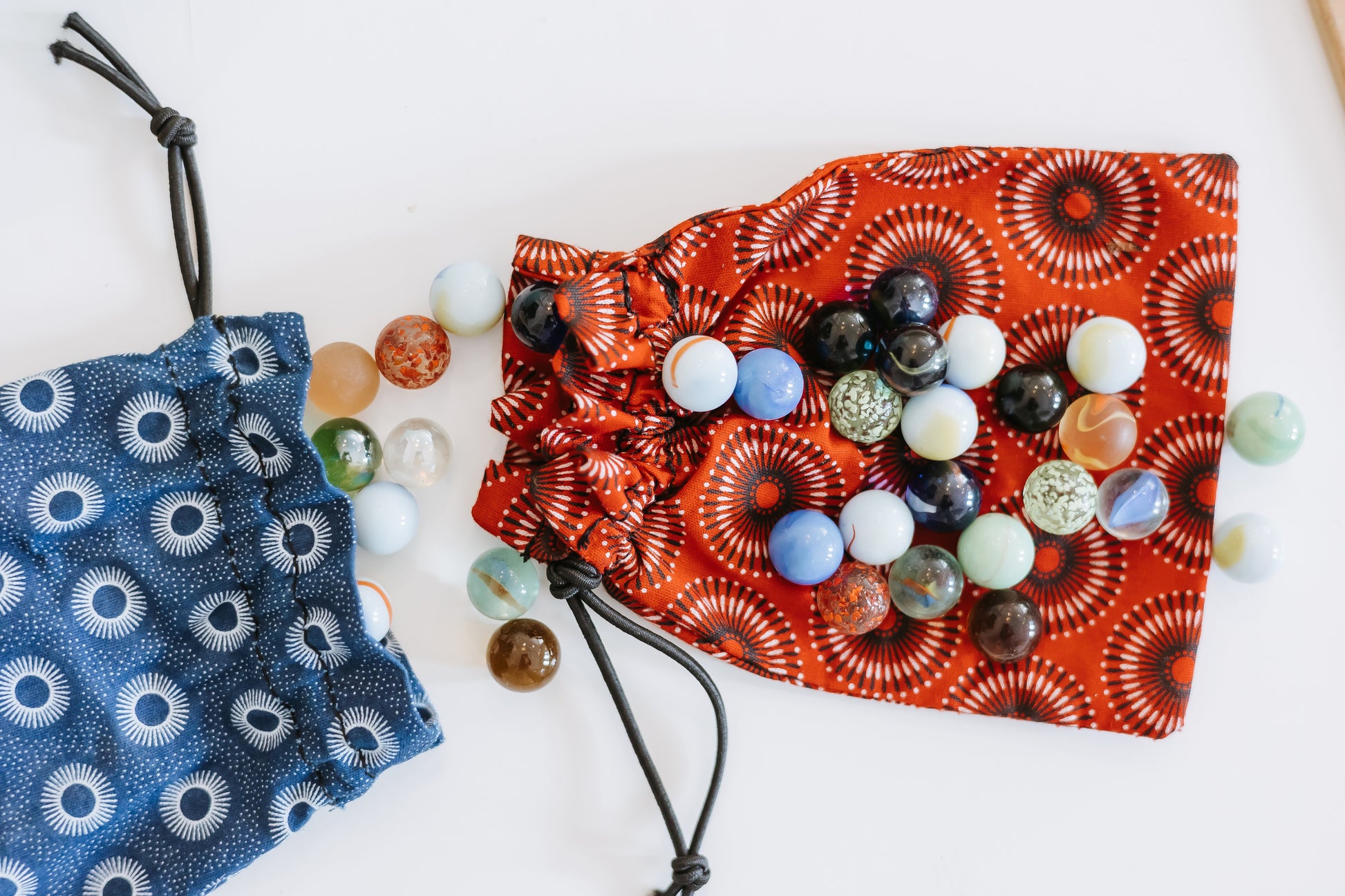 - A collection of marbles stored in a cute child-friendly drawstring Shwe Shwe bag.